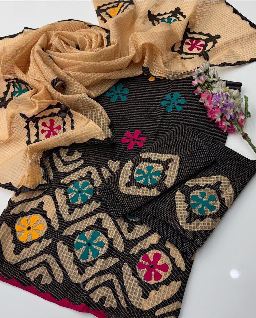 KHADI KHADDAR APPLIQUE & HAND EMBELLISHED EMBROIDERED UNSTITCED 3pc✓*
